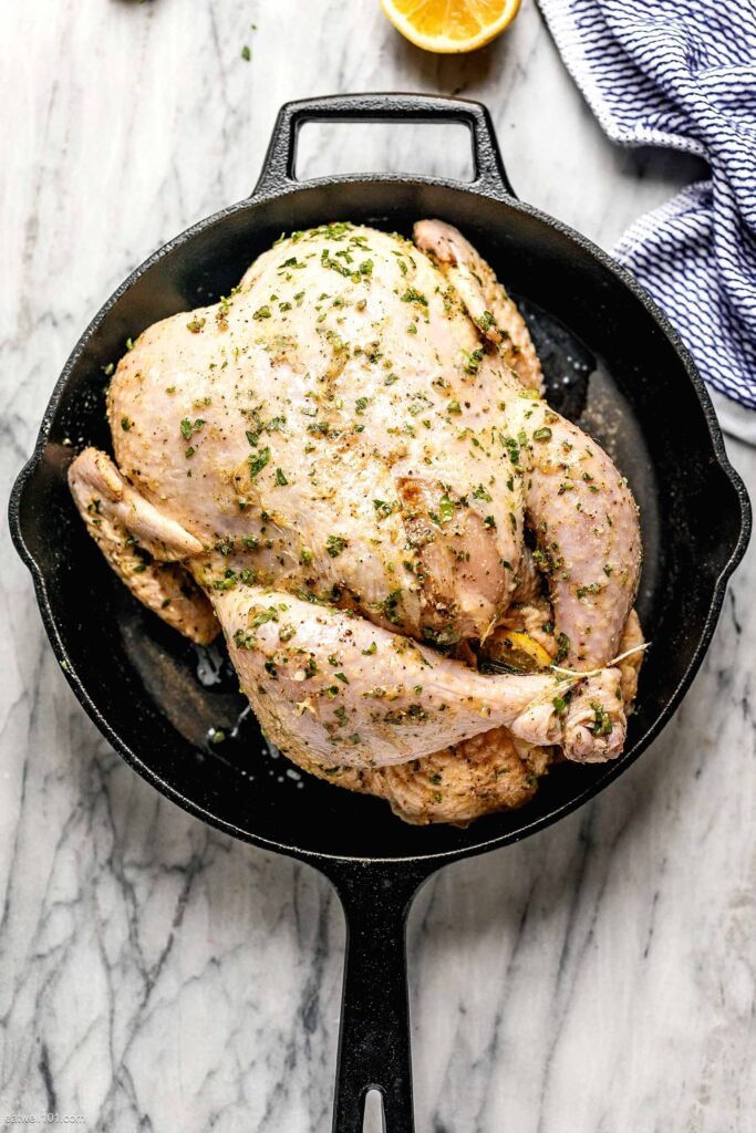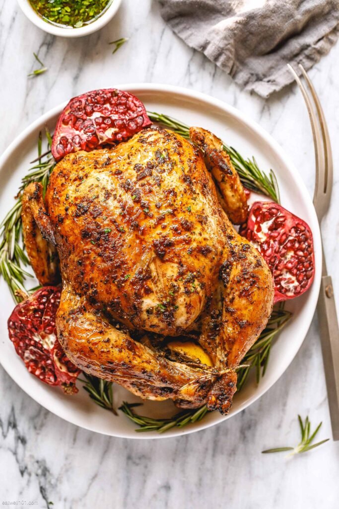 This oven-roasted chicken has crispy skin and is so juicy! The whole chicken is roasted in garlic and herbs-infused butter. Worthy of an elegant holiday dinner or any party!