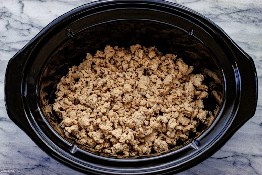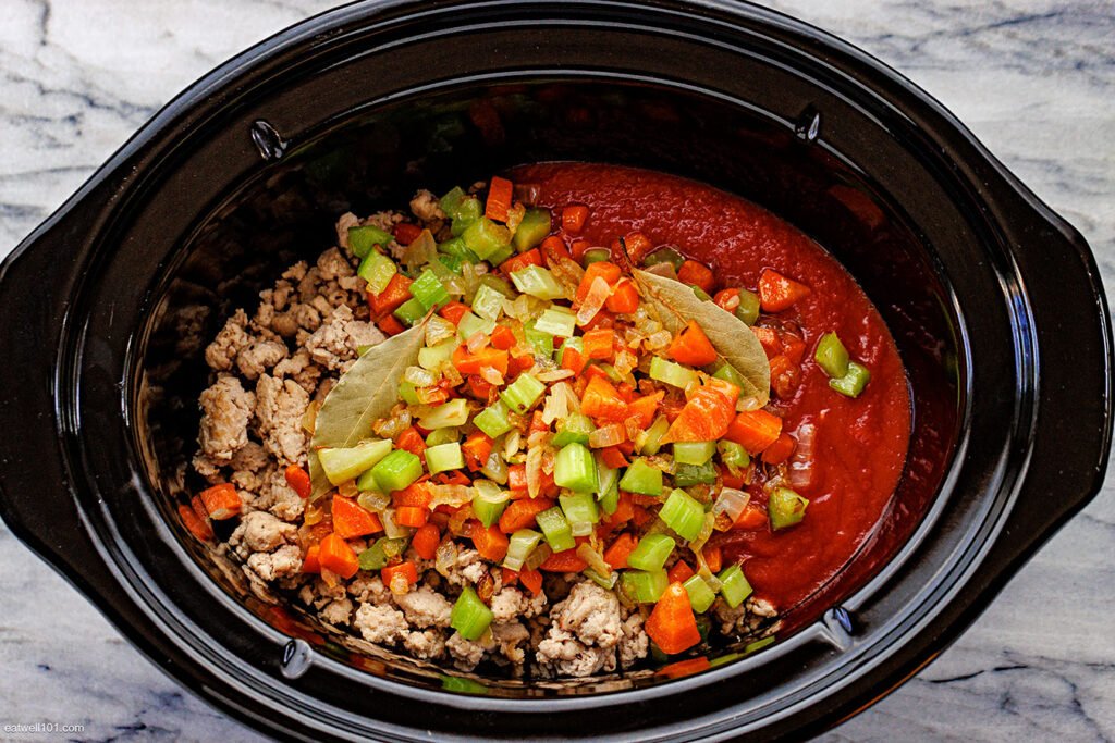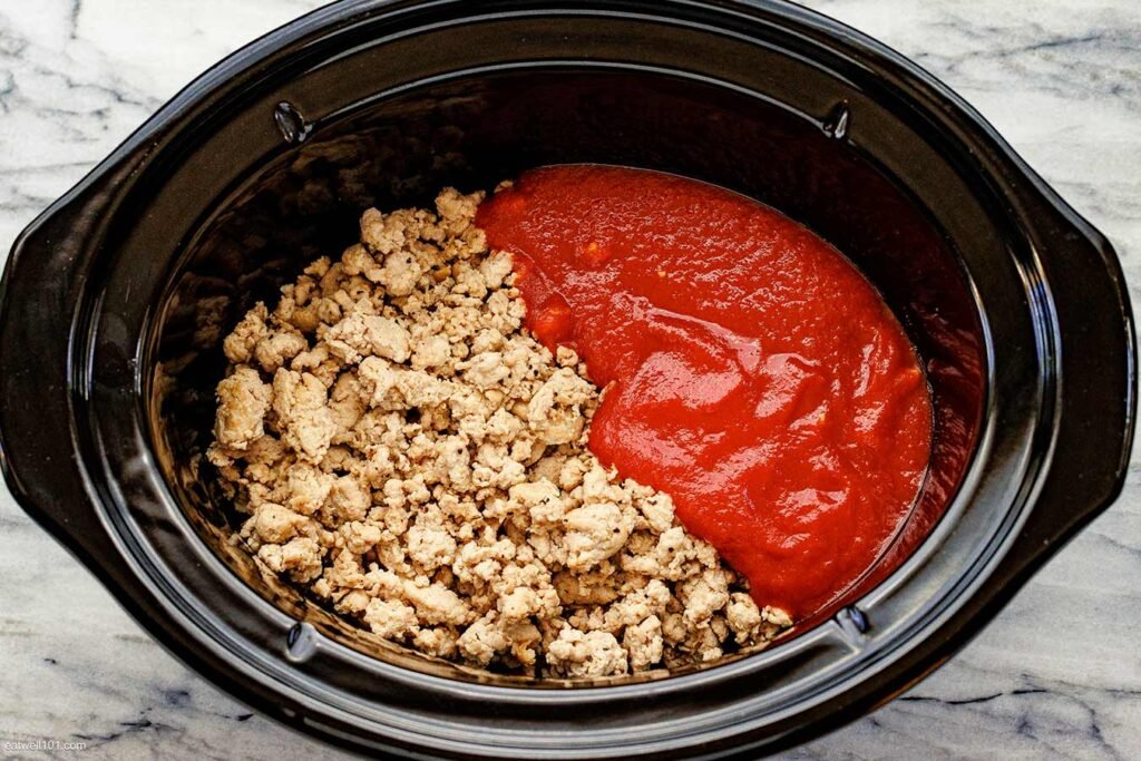 - Prepare the turkey ragu in the slow cooker: Brown the ground turkey in a large skillet over high heat with one tablespoon olive oil and 3/4 teaspoon salt. Cook the turkey flesh for 4 to 5 minutes, breaking it up with a spoon until it’s cooked through. Place the turkey ground that has been cooked into the slow cooker.